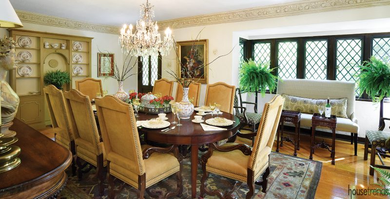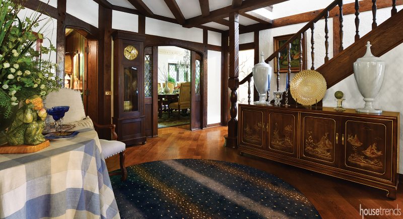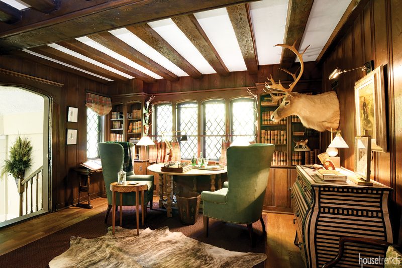 An eclectic mix of patterns and textures helped to complement the dark wood molding and beams as well as the elaborate architecture in the stunning Tudor Revival.