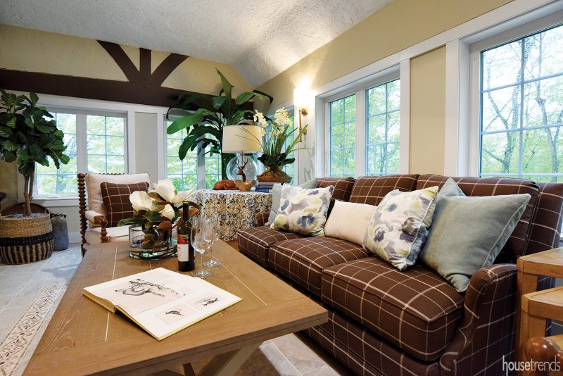 Several designers opted for classic plaid or tartan in their spaces, including the foyer, library and living room. Other rooms featured subtle fabrics in earthy tones, such as the brown striped sofa on the porch, or bold prints as seen in accent pillows in the first-floor guest bathroom.