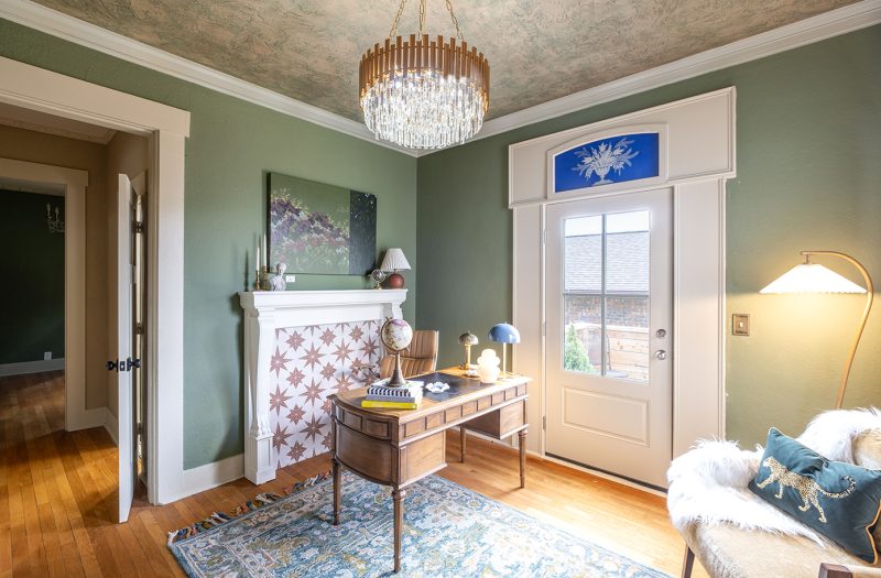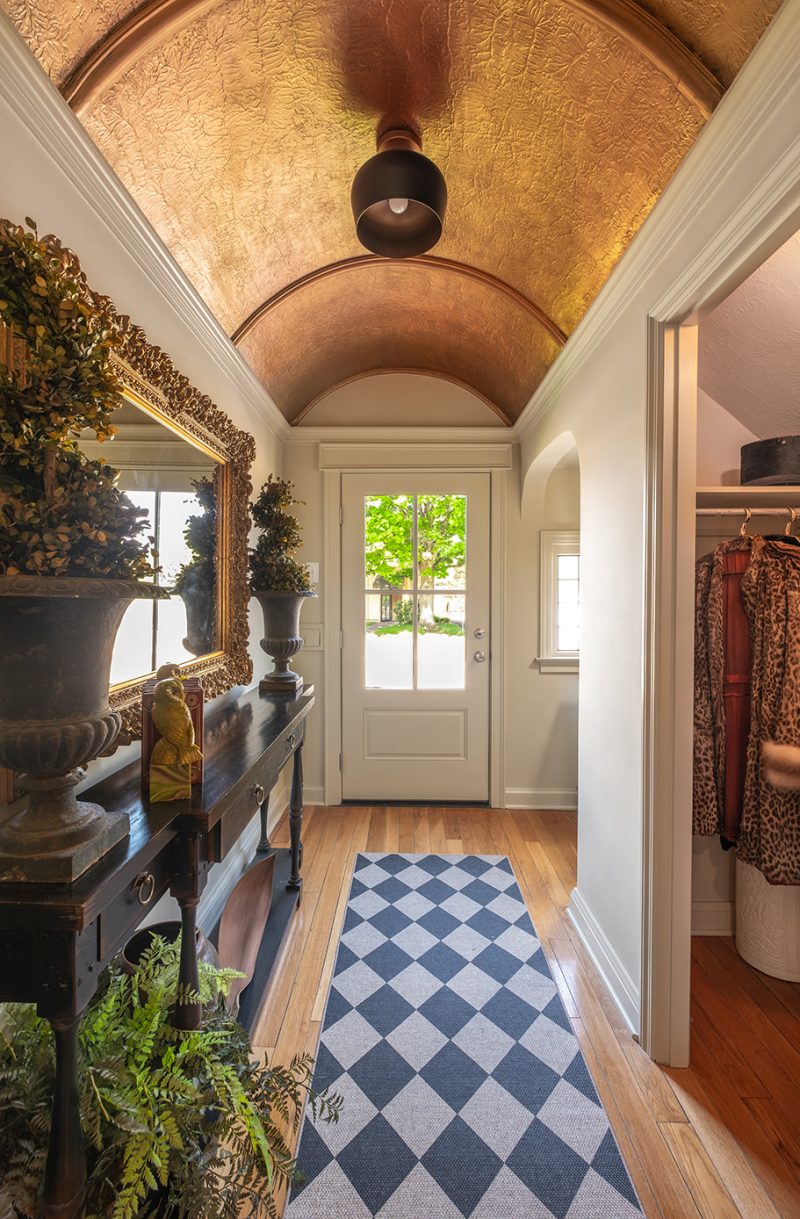 The entryway’s original wood floor is crowned by a plaster barrel ceiling enhanced by artist Tracy Earl.