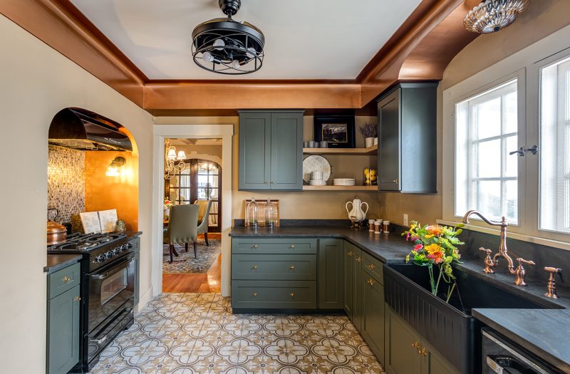 The kitchen is a warm, moody and inviting space with a blend of juniper, copper and black.