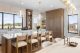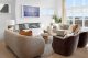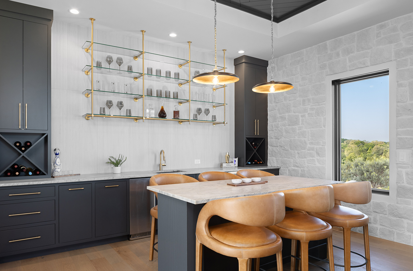 A large opening over the sink looks into the family room, where the bright blue design continues on, obviously at first, but then more in a more subtle manner with just knick-knacks on the table.