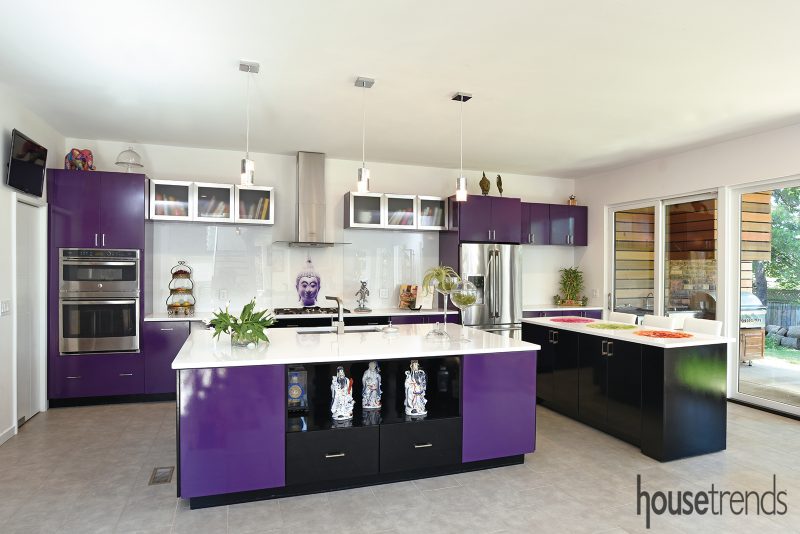 This contemporary Cincinnati homeowner brought a purple shoe to a meeting with her builder who then had paint mixed to match. The high-gloss paint gives the wood cabinets the look of lacquered aluminum.