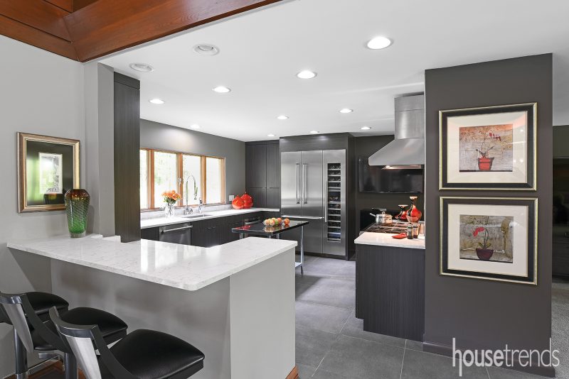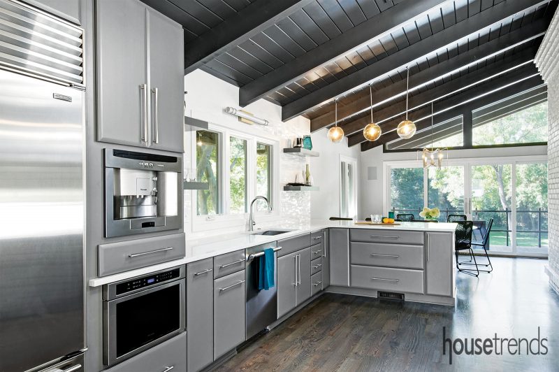Crisp white countertops meet flat-panel gray cabinetry and stainless steel appliances in this remodeled kitchen in a lovingly restored mid- century style home in the Dayton area.