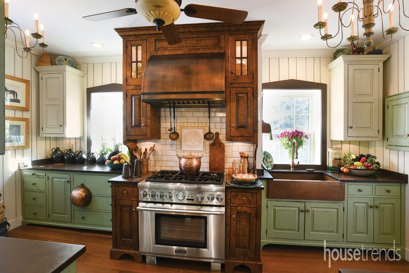 Handcrafted cupboards in this 1848 Federal style home in Waynesville, feature curly maple cabinets accompanied by cabinets painted in linen and moss.