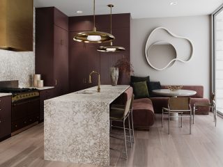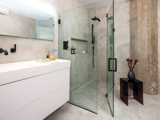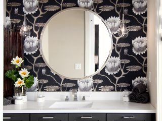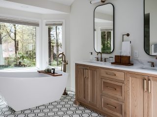 Technology isn’t often seen in bathrooms, but this space by Luxe Home and Design embraces it wholeheartedly with medicine cabinets that lift up electronically with the touch of a button, located conveniently at the bottom of the cabinet.