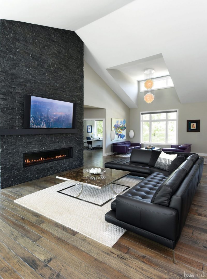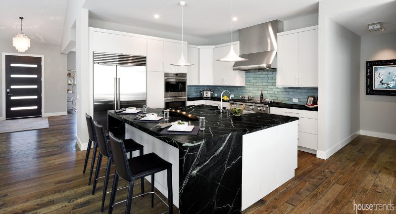 White veining strikes through the deep black of the Brazilian soapstone kitchen countertops, while the smoothness of this surface and others is countered by textured elements. Clean-lined elements like the leather seating are punctuated by eye-catching details—tufted seats, exposed metal frames and tidy tailoring. There’s the quartzite tile that ascends from floor-to-ceiling on the fireplace wall, and the five-inch hand-scraped hickory flooring that runs throughout the main floor.
