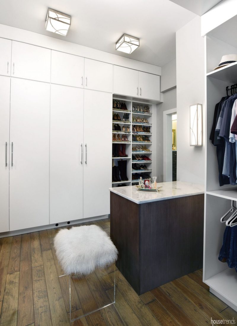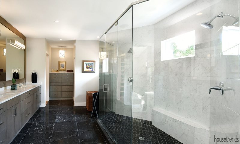 Renovations to the master bath, which is situated behind the kitchen, scored more points for easy living. By reconfiguring the existing footprint, flipping the placement of the sinks and shower and removing extraneous cabinetry, the couple got a spacious shower and a direct connection from the closet to the laundry room—all without sacrificing the deluxe walk-through closet.