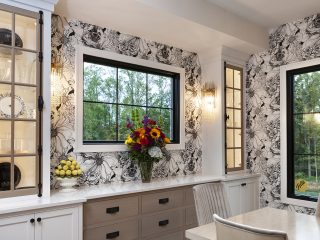 Coordinate accessories in a room to create a polished look. The fireplace mantel and table in this formal dining room feature the same floral accessories and china.