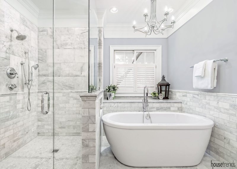RESOURCES Designer/contractor/cabinetry Kitchen Kraft; Fixtures, faucets and lighting Ferguson; Countertops Honed Carrara marble, Perrotta’s Marble Shop; Tile Honed Bianco Venatino Marble, and zero-entry shower floor: Hamilton Parker Company; Frameless shower door Buckeye Custom Glass
