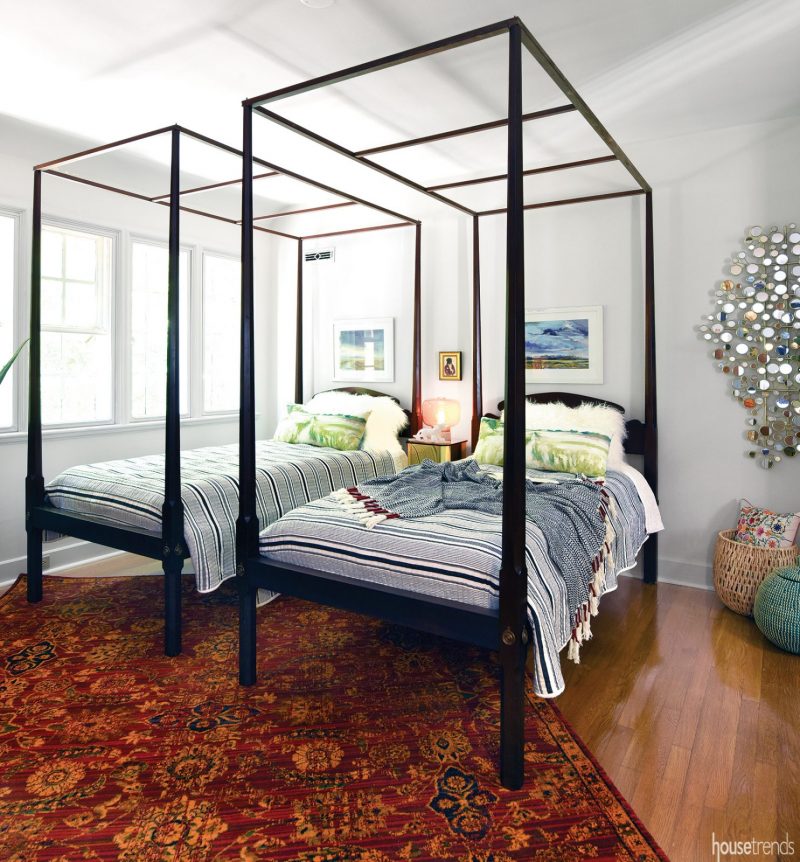 In the second floor guest bedroom, Laura Quinn from happyroost used black and white as a backdrop to show off the beautiful reds and greens seen in the bedding and area rug accenting the floor.