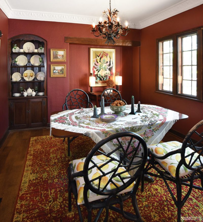 The two dining areas in the home featured dramatically different designs. John Stuart selected a sultry burgundy shade for the breakfast room, while Sharon Bledsoe and David Fair utilized smooth camel and gold tones for the elegant formal dining room.
