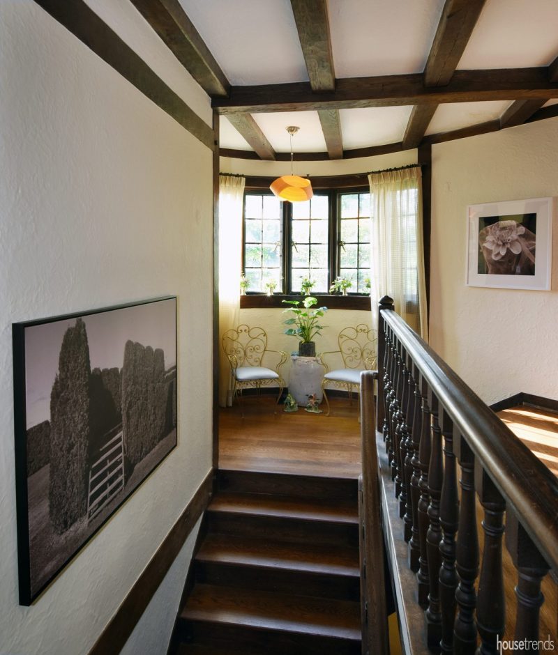 An eclectic mix of patterns and textures helped to complement the dark wood molding and beams as well as the elaborate architecture in the stunning Tudor Revival.