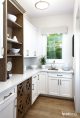 While many of the kitchens we are seeing these days feature white, off-white or soft gray cabinetry, a sure-fire way to warm up these classic neutrals is by adding natural elements to the space. By balancing its crisp look with a walnut island countertop and a dramatic waterfall edge, this room stays true to its minimalist nature but adds an inviting layer of warmth. While, this mid-century-style kitchen may be on the small side, its impact is mighty.