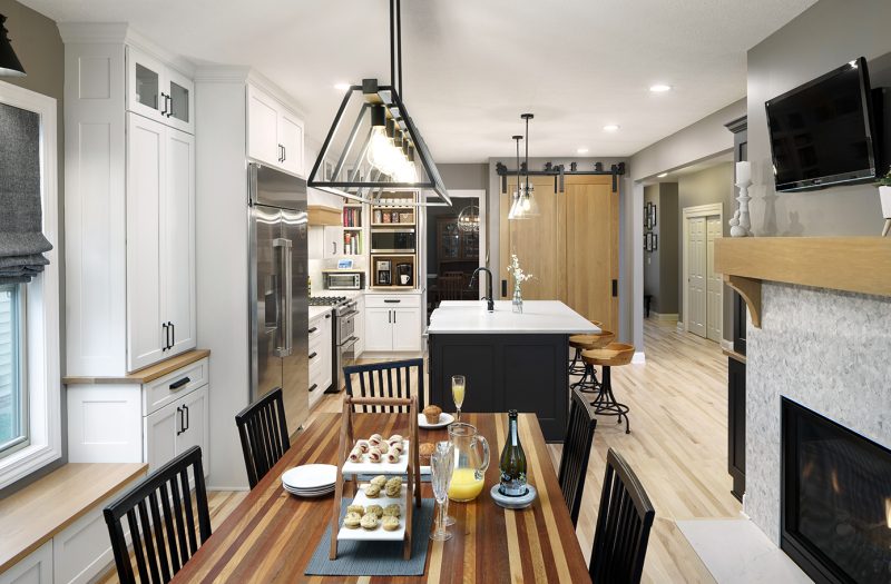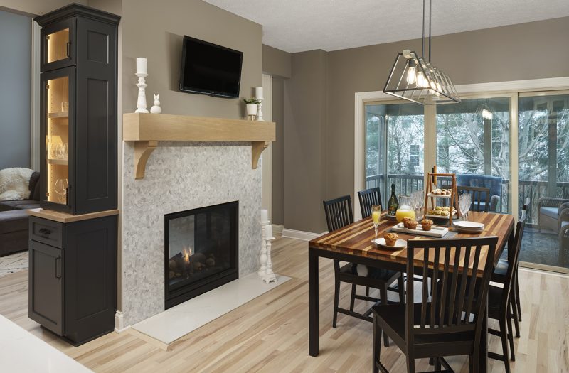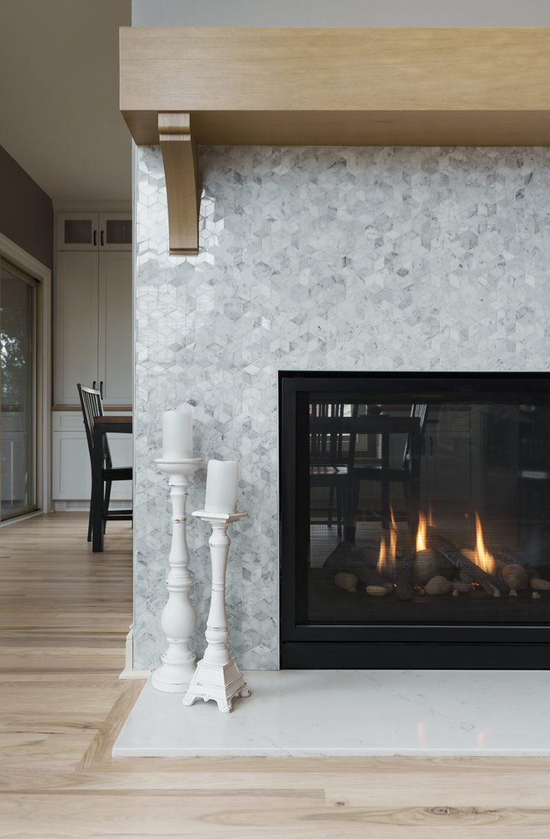 Construction The Cleary Company; Design Katie Florjancic, The Cleary Company; Cabinetry Shaker door in Starless sky on island and bar, Snowbound on perimeter. Bench cabinet in white oak; Countertops Vadara Quartz Carrara Nuovo; Backsplash Anticato Cerato Carrara 4 x 12 honed; Hardware Channing from Top Knobs; Faucet Moen; Sink Kohler Ironridge Cast Iron; Sconces Savoy House Morland; Island Pendant One Light Pendant, Elegant Lighting; Dining chandelier Open Frame Linear, Shades of Light; Fireplace White oak mantel, Emser Tile White Cube Link Collection façade, Vadara Quartz Carrara Nuovo hearth