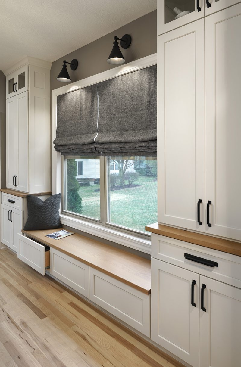 “We always wanted a bench seat under the window in our dining room,” Matthew says. “That was one of our must-haves.” The storage was moved to the cabinets that flank the window seat. The drawers below the seat are push to open. “We find that those are really great, because if you want to use the window seat you’re not getting caught on the hardware,” Florjancic explains.