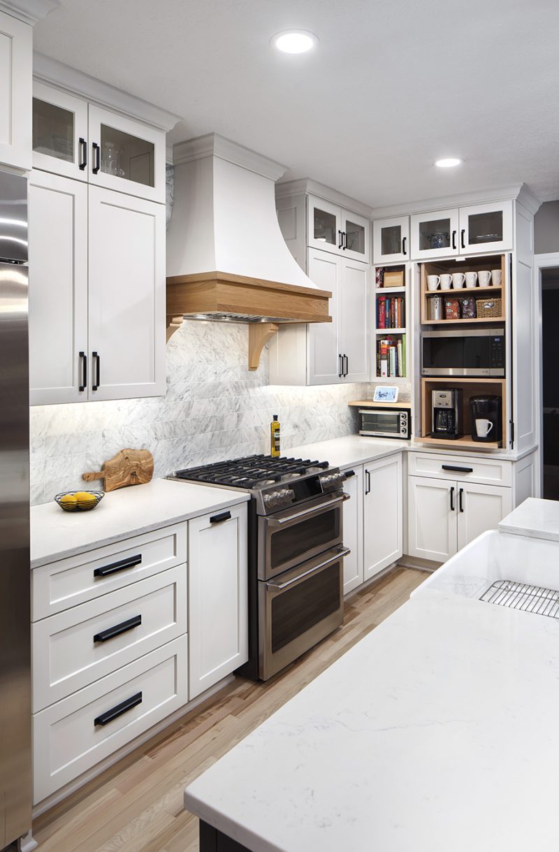 “With two teenage boys, you can imagine the microwave and pantry are highly used,” Florjancic says. Garage door cabinetry was used to camouflage these appliances. “They wanted these easily accessible but outside of the main cooking space.”