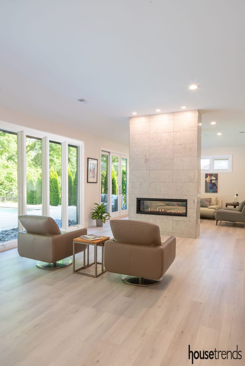 Farther along the back of the home stands a half wall with the see-through fireplace that separates the sunroom from the main living areas. The wall was Tonia’s idea and got a stamp of approval from Diane. A large, walk-in closet off this room houses a collection of toys for the grandkids. Weekend sleepovers with “TT” and “Poppy” are a regular occurrence.
