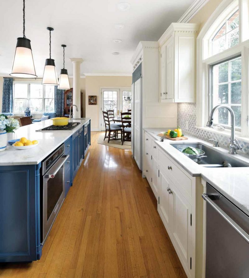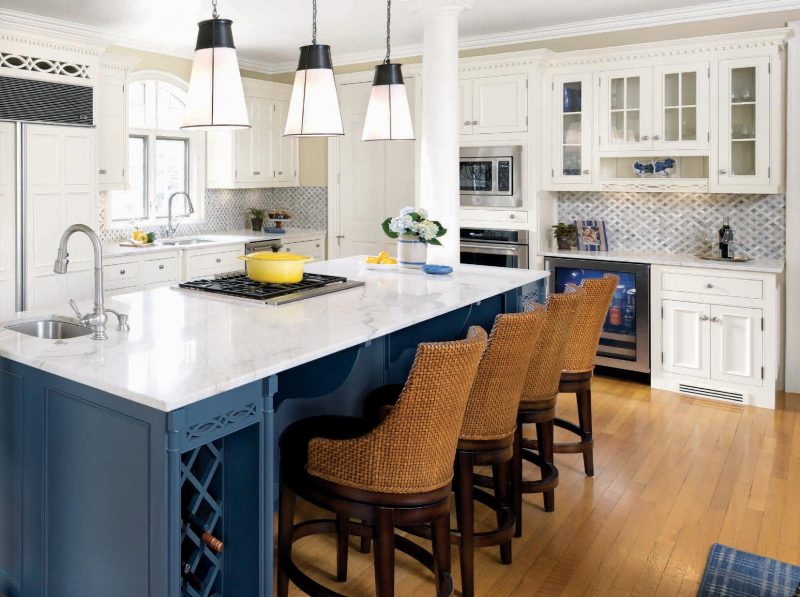 RESOURCES General contractor Beverley Builders; Interior designer Susan Berg Design; Cabinetry Schlabach Wood Design; Kitchen lighting Robinson Pendants, Visual Comfort; Kitchen paint Benjamin Moore White Dove and Van Deusen Blue; Wall treatments Asian Scenic by Thibaut; Flooring Plaid rug from Couristan; Family room window treatments Ralph Lauren; Kitchen countertops Mont Blanc quartzite; Kitchen backsplash Maravilla marble mosaic; Appliances Jack’s Appliances
