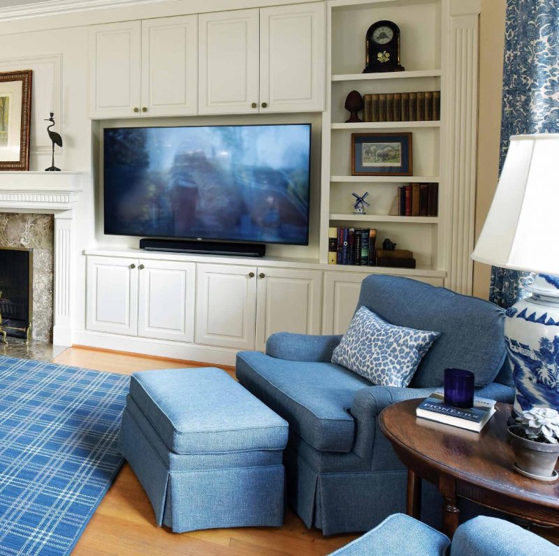 A greater challenge was redesigning the family room’s bookshelves for the fit and function of a modern-day television while keeping the visual symmetry of the existing structure.