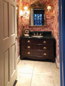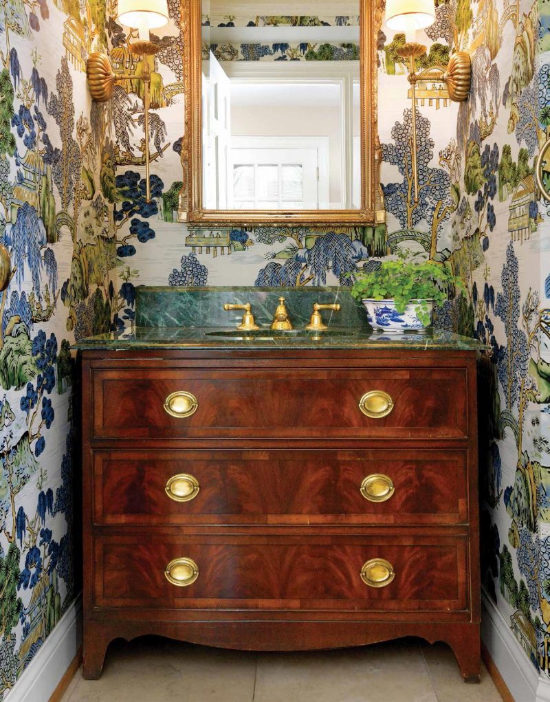 The home’s side entrance has a direct line view of the half bath, now a definite eye-catcher due to the distinctive wallpaper. “Kevin and Melanie wanted to keep their antique vanity which has a green marble countertop. This design harmonizes the piece with the new blue tones in a very dramatic way,” says Susan.