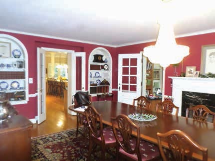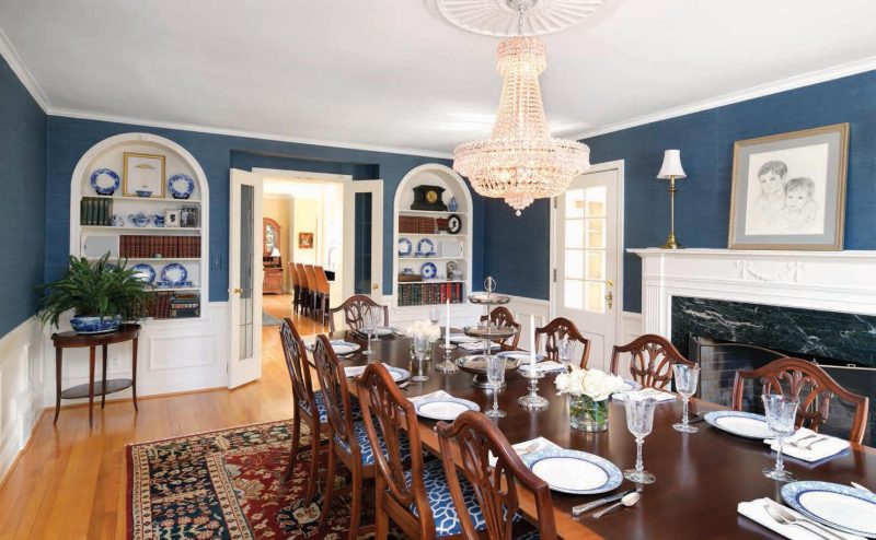 In the dining room, Susan proposed a deep blue grasscloth covering for the upper walls with faux ivory wainscoting below to transform the room. An applied molding was installed below the existing chair rail and then painted, creating the look of wainscoting without the premium cost. “With only one window in the room,” describes Susan, “incorporating a lighter color was essential.”