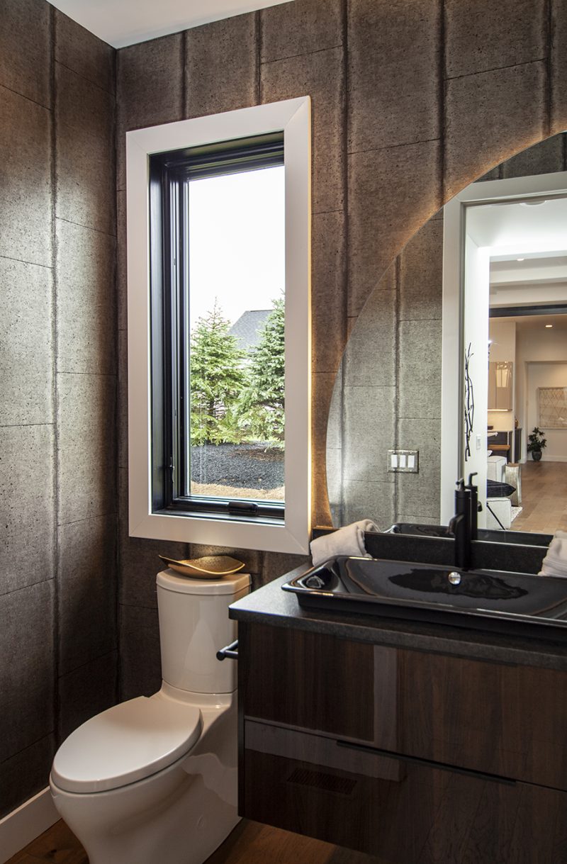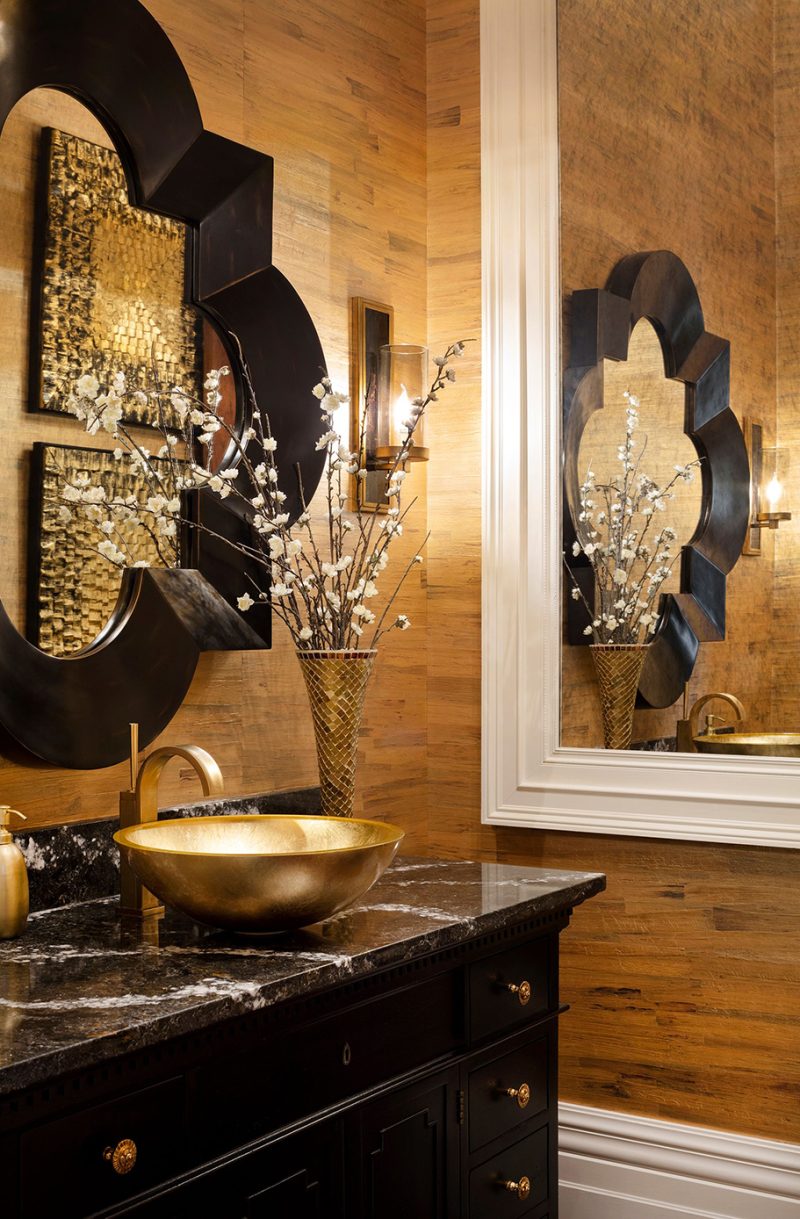 A bold, sophisticated black and gold color scheme creates the dramatic look this homeowner wanted. Wallpaper resembling hardwood frames in the black, furniture-style vanity cabinet which adds valuable storage as well as drama.