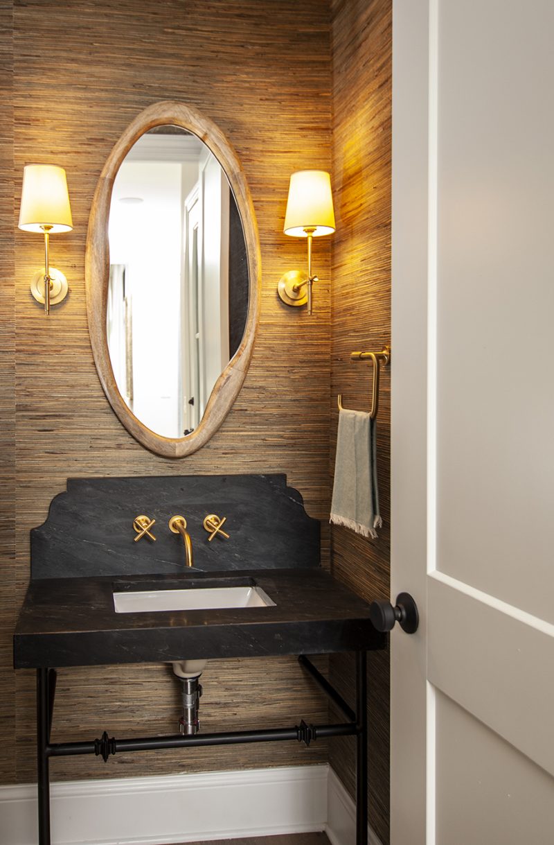 Textural “Juicy Jute” wallpaper by Philip Jeffries adds a warm backdrop to this custom-made honed soapstone console. The antique brushed brass light fixtures, and a brushed brass Kohler faucet introduce another layer of warmth and add to this space’s elegant look.