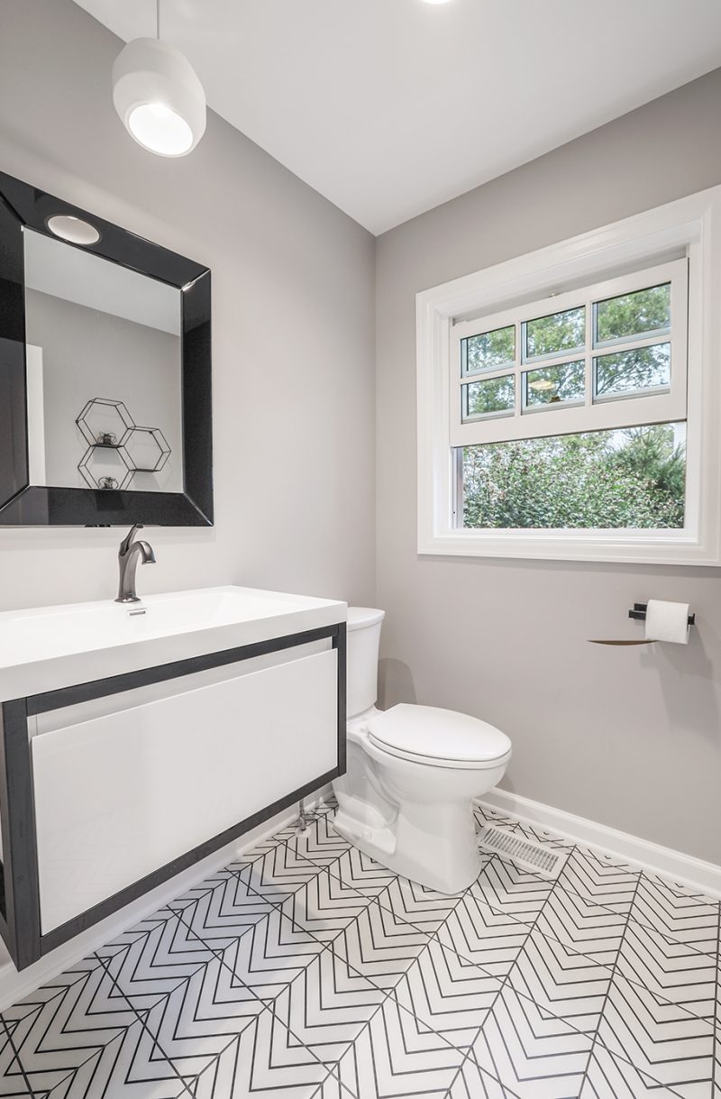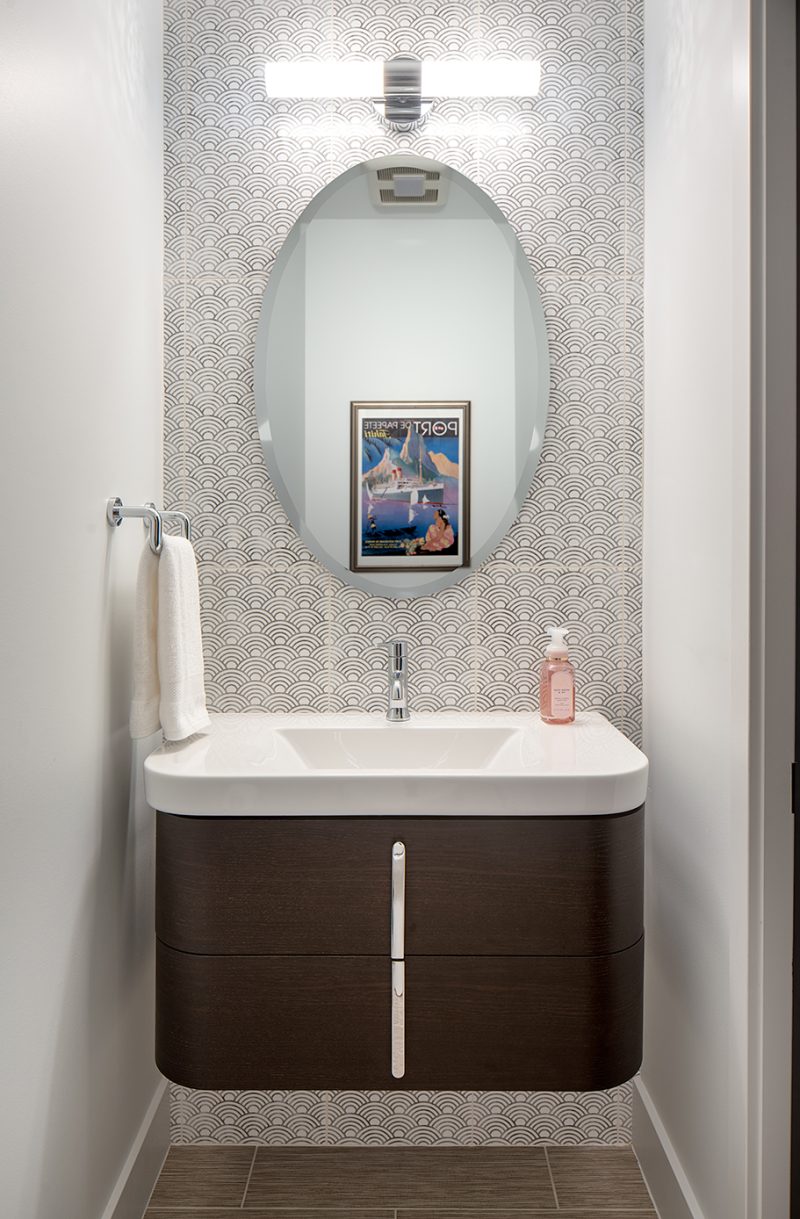 The art deco style tile was the launch point for homeowners who wanted to have a little fun with their powder room. Next came the vanity that ties in beautifully with that era. The console provides ample storage and floats for easy cleaning beneath it.