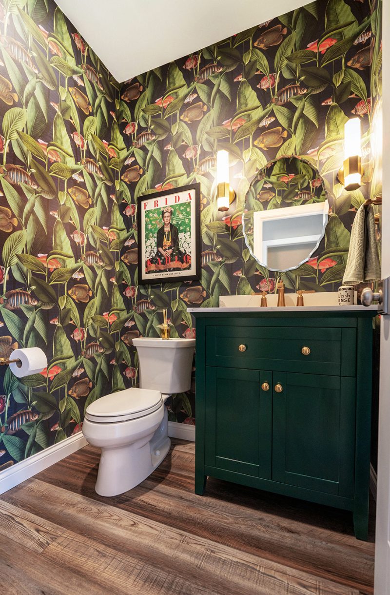 Mexican artist Frida Kahlo was the inspiration for this lush, colorful room. Aquarium Deep Sea wallpaper by Graham & Brown, selected by the homeowner, and a Forest Green vanity add to the rich palette. Brushed gold fixtures introduce a bit of bling while Vintage Oak luxury vinyl flooring grounds the space with a warm, rustic touch.