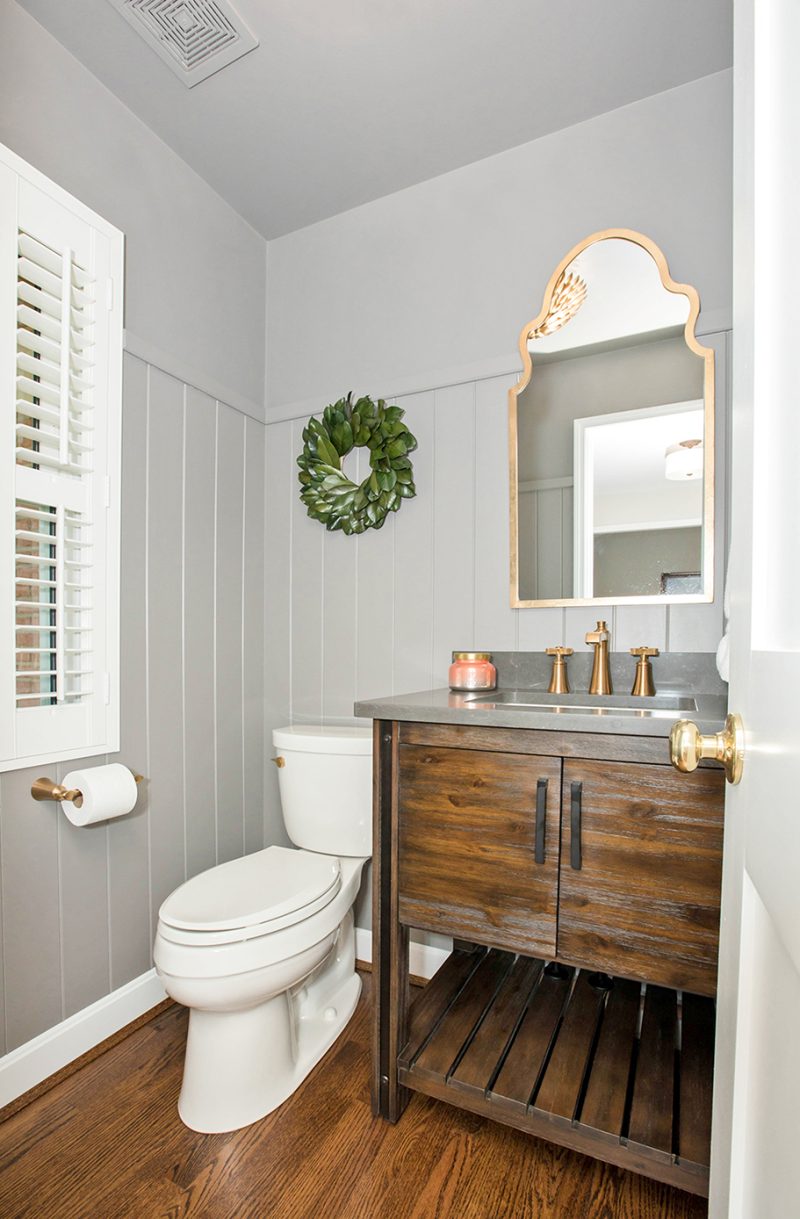 The first six feet of these walls are wrapped in V-groove paneling for dramatic effect. The darker textured wood vanity adds a welcome contrast against the Sherwin-Williams Dovetail painted panels. Gold in the plumbing fixtures, mirror and light give the room a little sparkle.