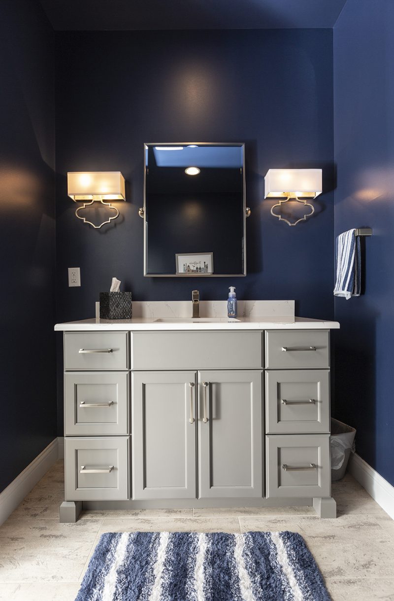 Knowing the homeowner was partial to navy blue, the designer chose soft gray for the cabinetry and flooring to provide an appealing contrast. Even the ceiling is painted the same color—Sherwin-Williams Sea Mariner. Statement sconces complete the classic look.
