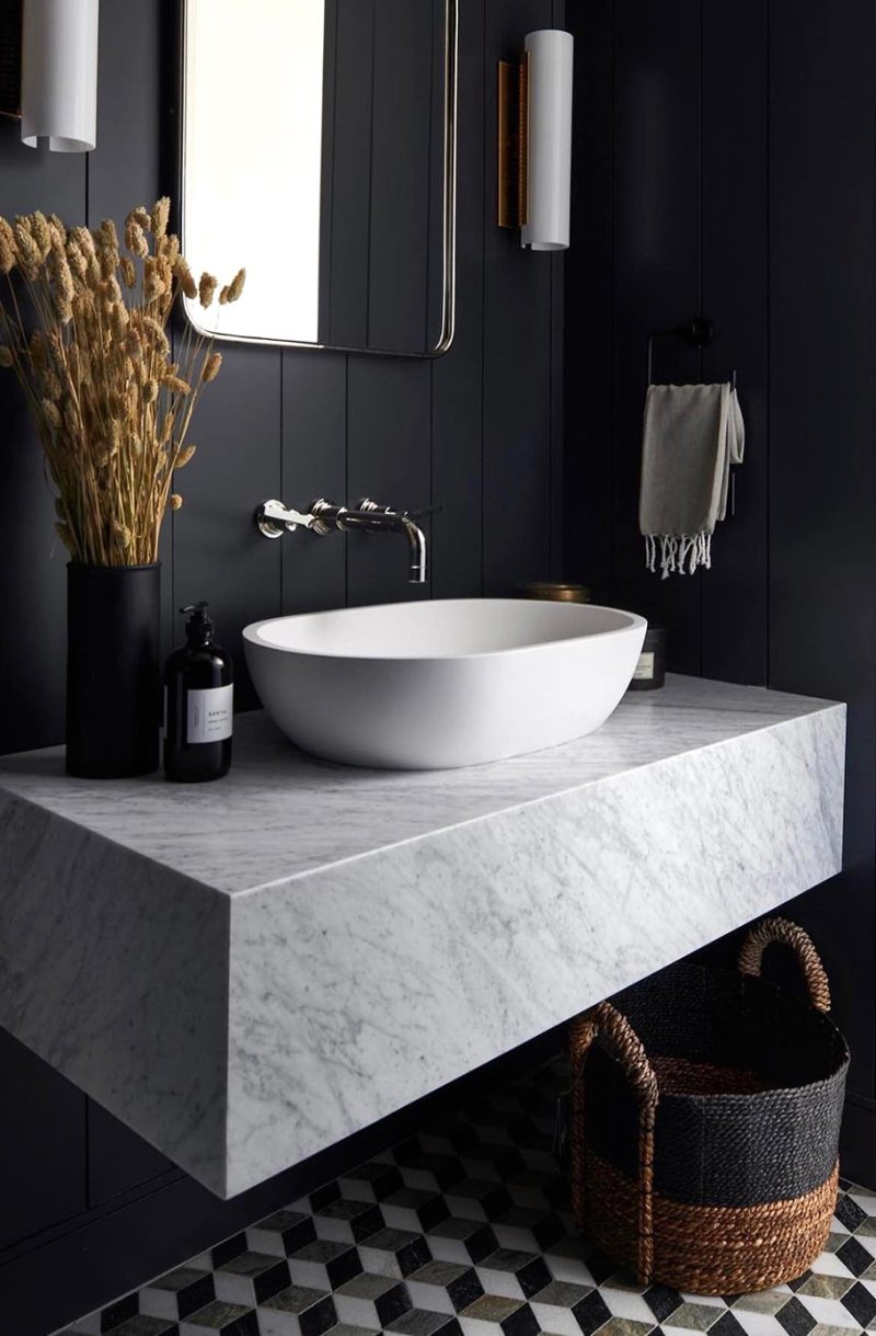 The oblong Atria Vessel Sink from Signature Hardware is perfectly suited for this space with its clean, contemporary design. The matte white finish is a striking contrast to the black paneled walls and 3-D illusion tile on the floor.