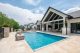 This outdoor living space includes a reflecting pool, waterfall, hot tub, and four seating areas for taking it easy when the owners are at home alone or to break up larger conversation groups when they entertain more formally.