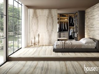 In the master bedroom, light arrives in the form of a five-and-a-half foot fixture comprised of 300 crystal pieces, all installed by hand. “This is one of my favorite light fixtures that I’ve ever done, though the installation was challenging,” admits Neal.