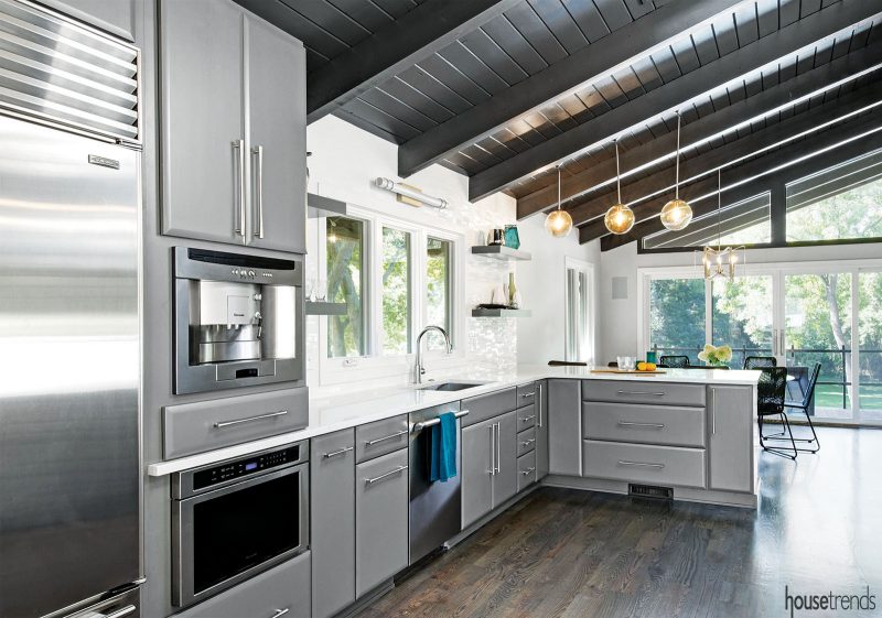When a midcentury home that was featured in the Columbus Parade of Homes in the 50s came on the market, it was purchased by a couple who knew the home had great potential and wanted to capitalize on its striking architectural features to make it a showstopper once again. In the kitchen, exposed rafters were painted espresso giving them a bit more depth and a seldom-used back door was removed, to make way for a microwave drawer and built-in coffee/latte maker.