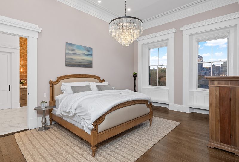 The view is equally important on the second floor where the couple’s master suite and studies are located. A sumptuous master bedroom leads to a dazzling master bath with those 14-foot ceilings. An eye-catching chandelier and a soaking tub angled in the corner provide for a perfect glimpse of the spire of the Church of the Immaculata in Mt. Adams, which is a strong focal point after dusk.