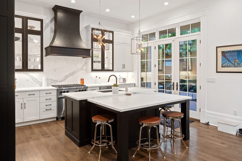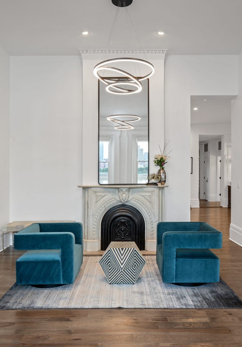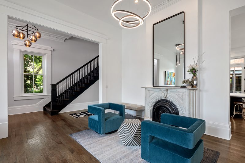 One example is the 10-foot-tall pocket doors that stand between the great room and parlor. While opening up a solid wall that separated the two rooms, the Legacy team discovered massive pine doors hidden within the wall. There was even a water mark on the doors about 30 inches off the floor, from the Ohio River flood of 1937. The doors were completely restored and painted to match the refreshed interior woodwork.