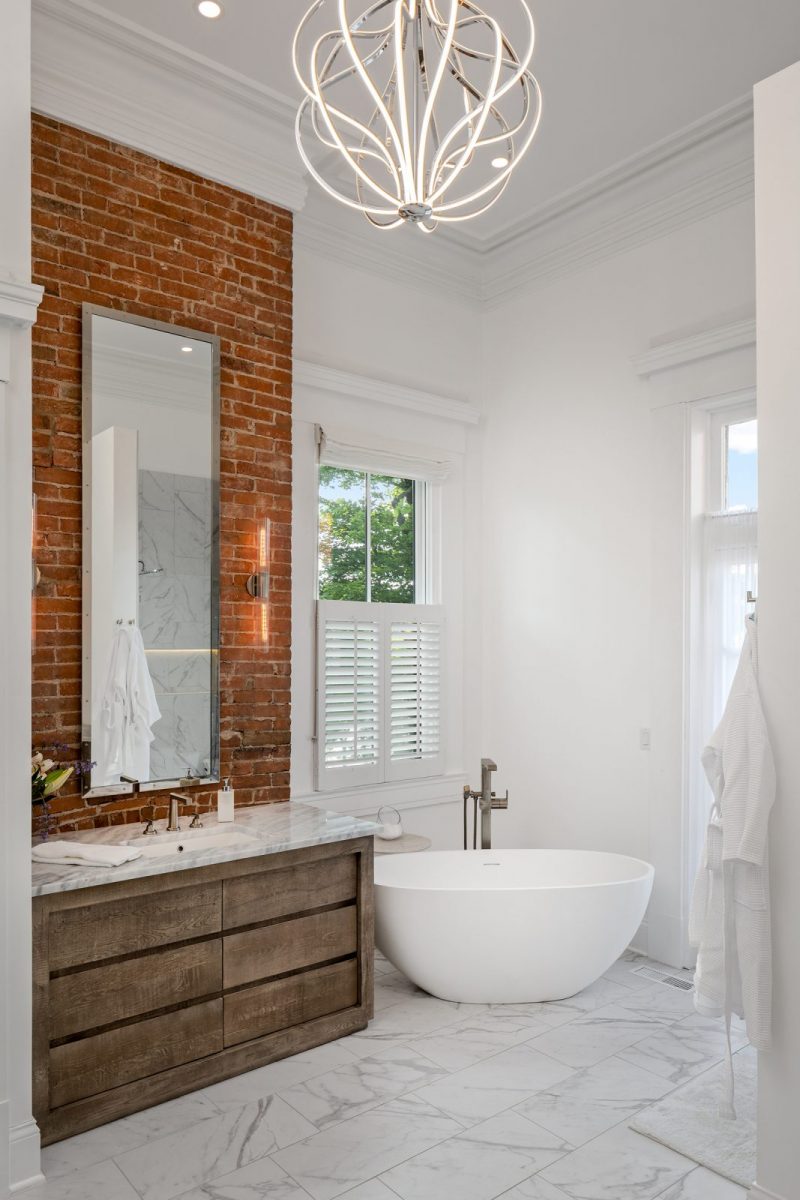 Several brick walls, fireplaces and ceiling beams were uncovered during the demolition as well. While there was some consideration for covering them up to give the place a more modern aesthetic, but Pattie pushed to keep them exposed, wanting the “bones” of the home to talk.