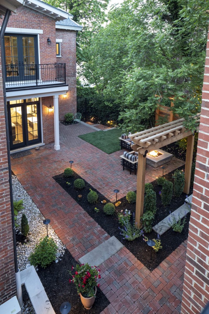 To allow the couple to enjoy the activity going on out their front door, the Byrons enlisted the help of Lichtenberg Landscaping, the firm responsible for creating the inner courtyard. Lichtenberg leveled the sloped front yard and built a paver walkway and patio to allow for riverside seating. The hardscape and plant materials were designed to draw visitors to the main front door, rather than the secondary door on the parlor side of the home. The home’s one small patch of grass is found here, and the owners cut it with a weedwacker. Family friend and gardener Rebecca Sheets helps with maintenance and adds splashes of seasonal color.