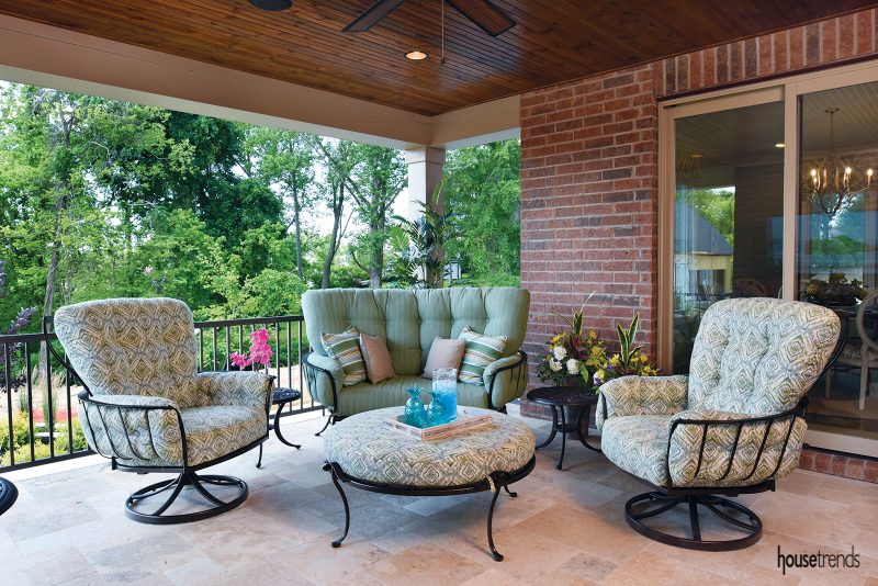 A definite draw is the 20-foot by 38-foot rectangular pool that features bubblers in the shallow end where the five grandchildren spend a good deal of time playing, and a sun shelf where the adults can relax and watch the activity. A sheer descent waterfall adds a whole other layer of interest. All of these features are showcased in a rainbow of accent lighting beginning at dusk. When they’re not in the water, the family relaxes in any of the several poolside spaces available to them. Furnishings for all of these areas—as well as many rooms inside—were supplied by Watson’s and selected by Chris’s much-loved interior designer, Henry Vittetoe.