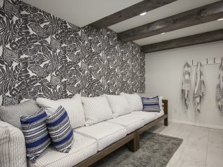 “Joan really wanted that room to look industrial, yet masculine,” says Brenda Tepper from The Hamilton Parker Company. Tepper worked with Joan to select all of the tile that was used throughout the home. Often the two would take their inspiration from a fixture in the room. In the men’s lounge for example, the two sinks with cobalt bowls were the starting point. The floors are gray porcelain and the wall tiles have a brushed nickel finish with cobalt blue dots randomly popped in.