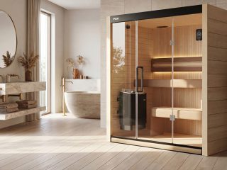 Across the hall, the men’s room is outfitted with more masculine fixtures with a similarly classic feel, but this time in blacks and grays with metallic accents.