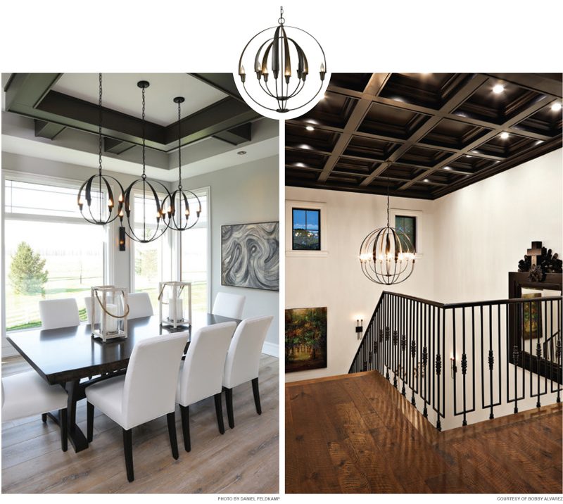 The Hubbardton Forge Double Cirque Chandelier is featured in a Dayton dining room and a Tampa stairwell.