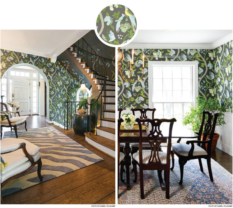 The Thibaut Janta Bazaar Charcoal Wallpaper, Caravan Collection is featured in a Dayton entryway and a Cincinnati dining room.