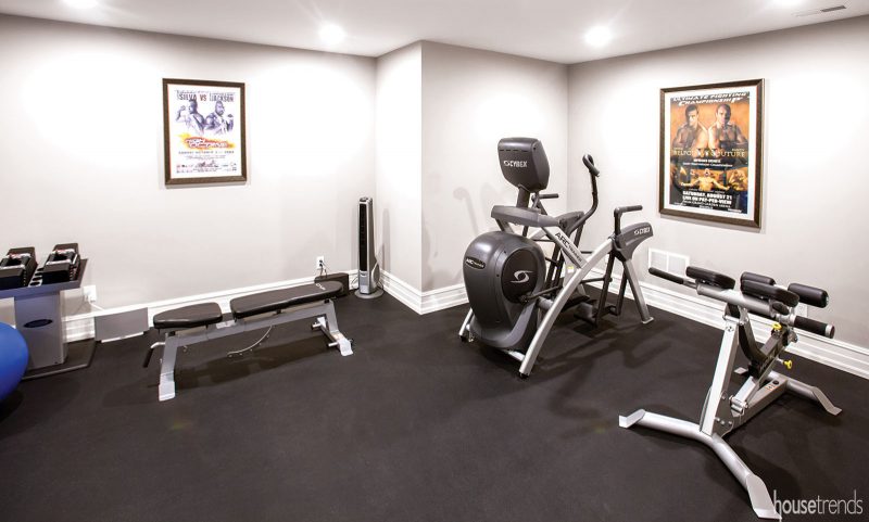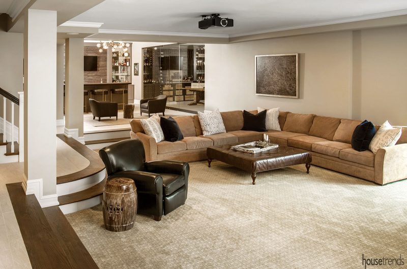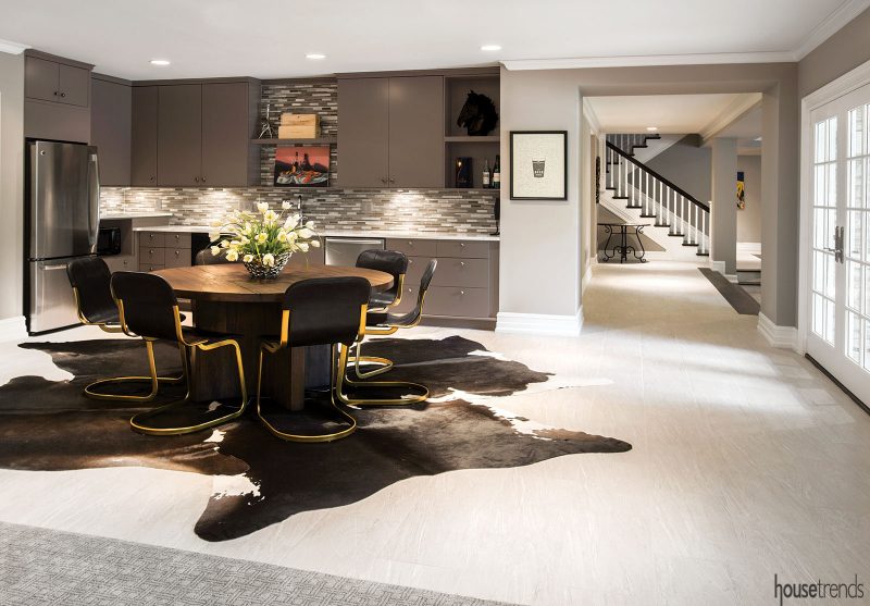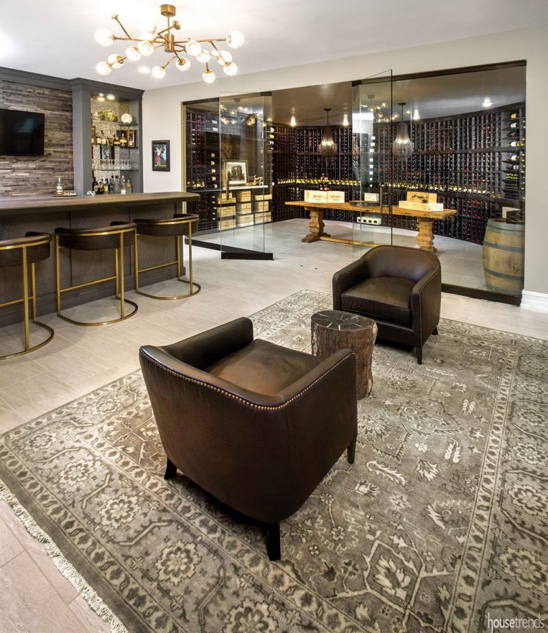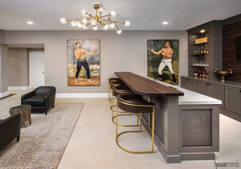 RESOURCES Contractor Neal’s Design Remodel, Project manager Mike Hendy, Designer Cyndi Kohler; Bar cabinetry Brookhaven Frameless Cabinetry; Bar leather inserts Osborne and Little Lyceum Aldwych; Wine room countertop Caesarstone Bianco Drift; Walnut countertop on bar CaféCountertops; Tile backsplash FriendlyWall by Finium; Tile floor Alfa Valmenco Crema 12×24, Hamilton Parker; Antique mirrors Ryan’s All-Glass; Appliances U-Line beverage refrigerator; Bosch oven; Wine racks Wine Cellar Innovations; Glass wall/doors Ryan’s All-Glass; Kitchenette Cabinetry Painted Sherwin-Williams Manor House; Countertop Trinity, Mont Granite; Flooring Alfa Yalmenco 12×24, Hamilton Parker; Appliances GE refrigerator; Bosch dishwasher; Faucet Delta Cassidy; HVAC Anderson Automatic; Exercise room flooring R&B Zip Tile Black on Black Rubber, McSwain
