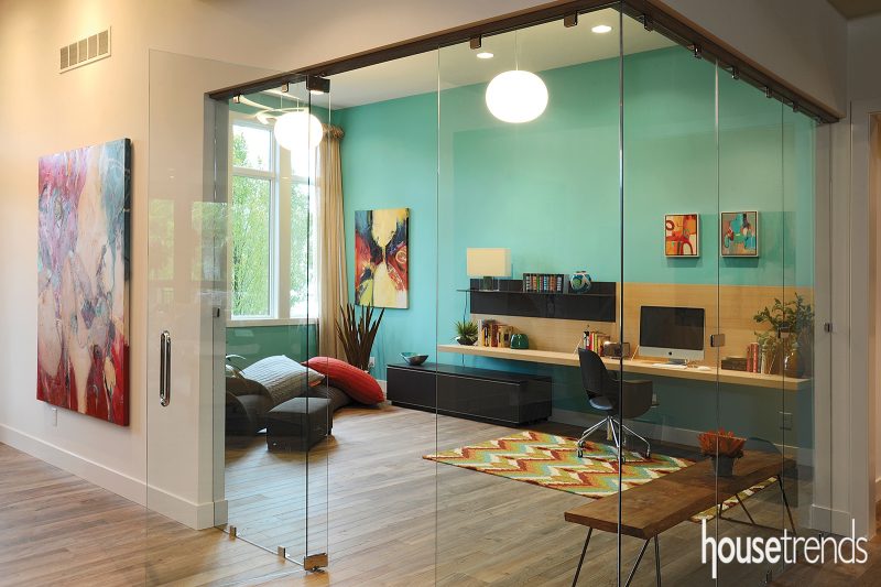Glass walls let the bold turquoise of the Cincinnati study flow through the rest of the home like a breath of fresh air. Source: Builder: Daniels, danielshomes.com