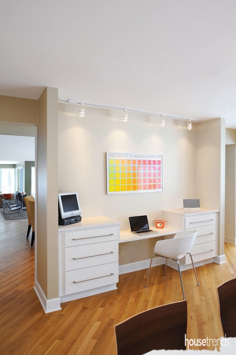 An alcove between the kitchen and living areas is the perfect space to house a small, but highly functional, office space in this Columbus home. Two banks of drawers provide plenty of organizational options. Source: JAE Company, thejaecompany.com