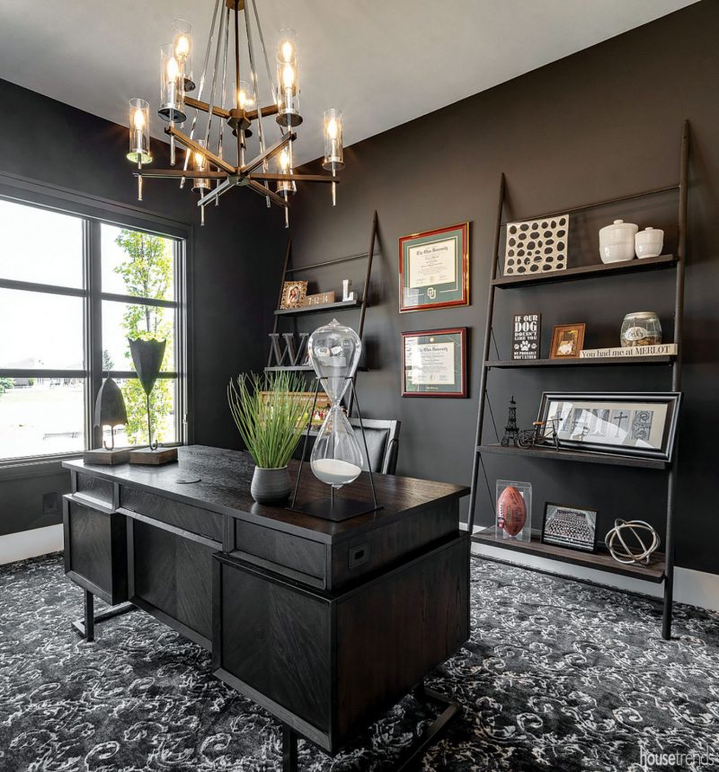 Cloaked in black, in the form of walls, window grids and furnishings, this space offers a dramatic take on the home office. A substantial chandelier adds welcome layer of warmth. Source: G.A. White Homes, buildgawhite.com