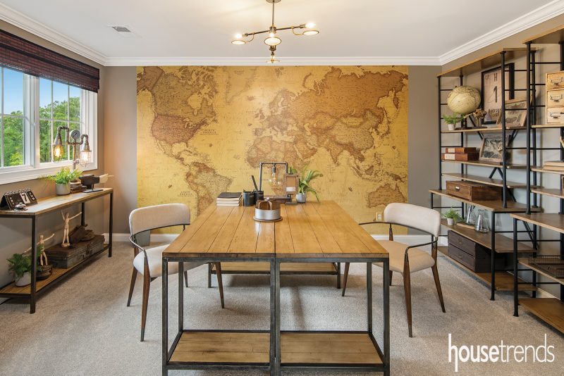With a current, slightly industrial take on a traditional partners’ style, this desk sits in the center of a Cincinnati area study made warm with woods, a contemporary light fixture, and an expansive wall mural. Source: J&K Custom Homes, jkcustomhomes.net