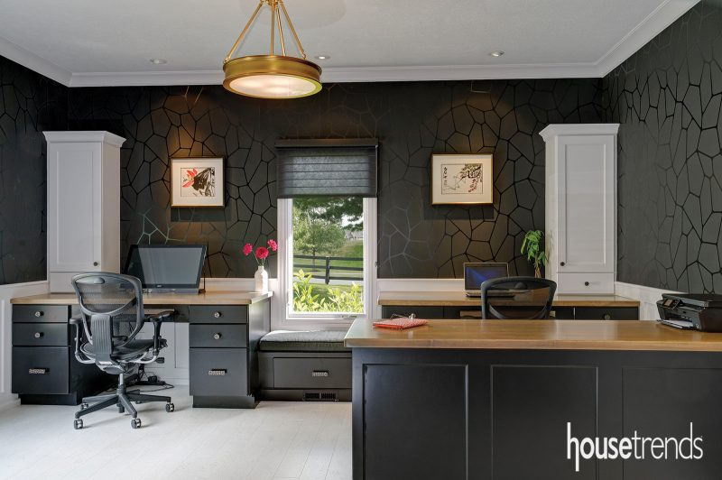 A dated study is transformed into a handsome his and-her office space with the help of built-ins which offer plenty of storage options. Contemporary wallpaper and a brushed brass light fixture add layers of elegance. Source: Dave Fox Design-Build Remodel, davefox.com